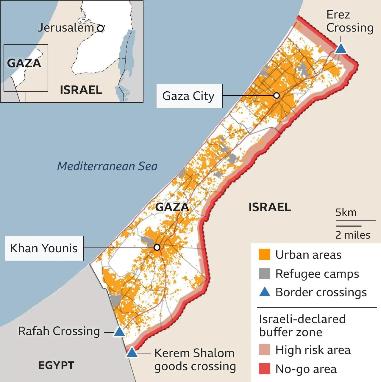 - Israel controls its airspace and shoreline, as well as what goods can cross Gaza's borders.