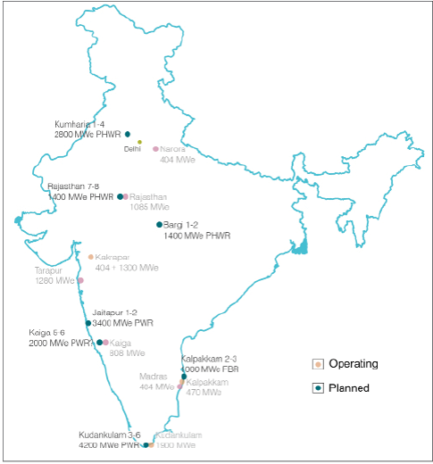- India has 21 nuclear reactors in operation in 7 nuclear power plants, having an installed capacity of 5780 MW and producing a total of 30,292.91 GWh of electricity while 6 more reactors are under construction and are expected to generate an additional 4,300 MW.