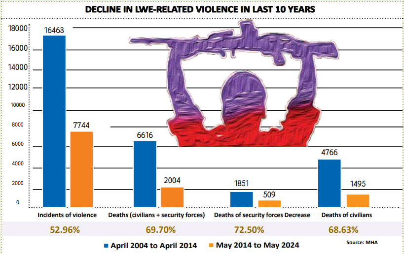 - 2014 और 2024 के बीच घटनाओं में 53% की कमी तथा सुरक्षाकर्मियों और नागरिकों के बीच हताहतों की संख्या में 70% की कमी।