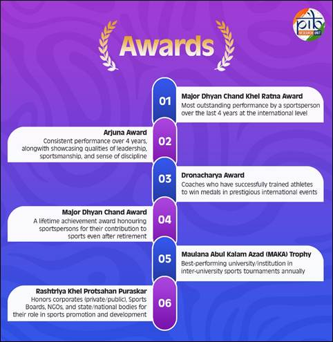 - राष्ट्रीय खेल पुरस्कार उत्कृष्ट एथलीटों को सम्मानित करते हैं, प्रेरणा और मान्यता को सुदृढ़ करते हैं