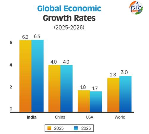 - India’s Growth outlook: India is projected to remain the fastest-growing large economy and is expected to grow by 6.2 percent in 2025 and 6.3 percent in 2026.