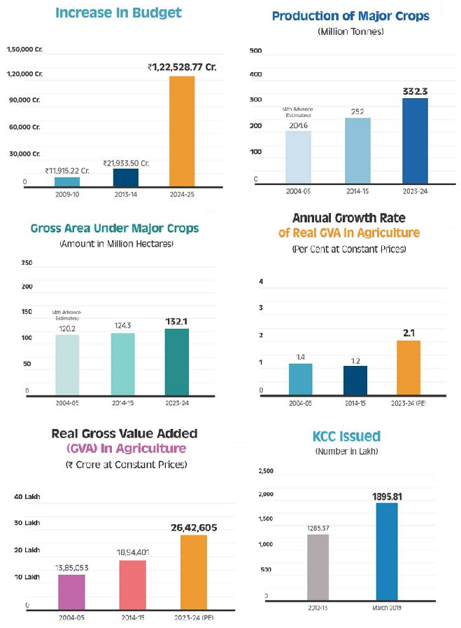 - By implementing farmer-centric initiatives, enhancing budget allocations, and promoting sustainable practices, the government is working towards ensuring food security, providing employment, and boosting overall economic growth.