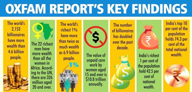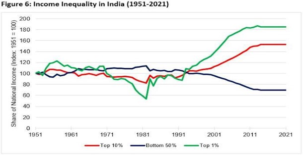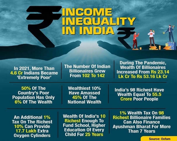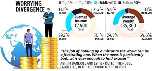 - As per World Inequality Lab, In 2022-23, India’s top 1% own 22.6% of India’s national income and 40.1% of the country’s wealth.