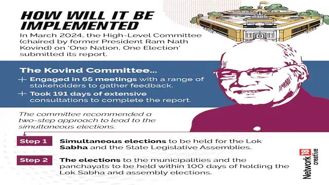 - A high-level panel headed by former president Ram Nath Kovind submitted its report to President Droupadi Murmu, in March 2024 had recommended simultaneous elections for the Lok Sabha and state assemblies as the first step followed by synchronized local body polls within 100 days.