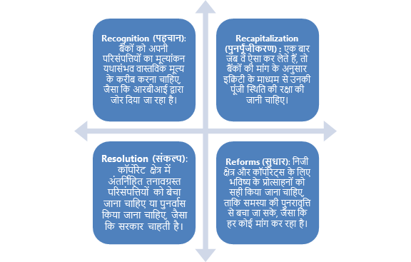 आर्थिक सर्वेक्षण 2015-16 में बढ़ते गैर-निष्पादित संपत्तियों (NPAs) और ट्विन बैलेंस शीट समस्या को व्यापक रूप से हल करने के लिए ‘फोर आर (4R) समाधान दृष्टिकोण’ की सिफारिश की गयी। इस दृष्टिकोण के 4R में शामिल हैं:
