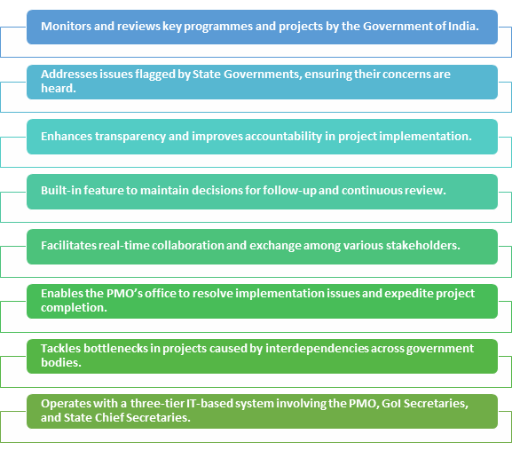 - परियोजना निगरानी: उच्च-मूल्य और महत्वपूर्ण अवसंरचना परियोजनाओं की प्रगति पर नज़र रखना तथा विलंब या अवरोधों को दूर करना।