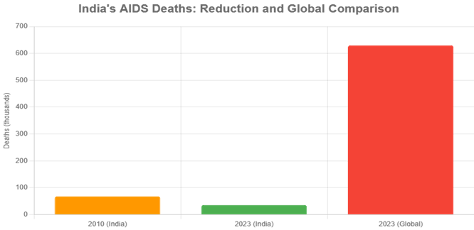 - भारत में एड्स की कमी वैश्विक औसत से अधिक प्रमुख है, जिसे व्यापक परीक्षण, एंटीरेट्रोवायरल थेरेपी तक बेहतर पहुँच, उच्च-जोखिम समूहों तक केंद्रित पहुँच एवं कलंक से लड़ने की पहलों द्वारा समर्थित किया गया है, जो राज्य और समुदाय की संयुक्त कार्रवाइयों के माध्यम से लागू की गईं।
