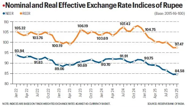 • NEER: 90.75 (जनवरी 2025) से घटकर 84.58 (अक्टूबर 2025) हो गया — केवल नौ महीनों में 6.8% की गिरावट।