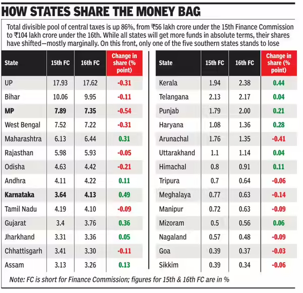• 41% पर यथावत: आयोग ने राज्यों का हिस्सा विभाज्य कर पूल में 41% रखने की सिफारिश की (15वें वित्त आयोग के समान)।