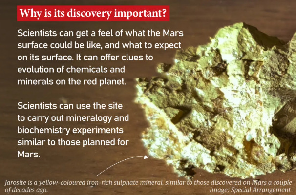- शोधकर्ताओं ने गुजरात के कच्छ जिले के मातानमढ़ गाँव में जारोसाइट की उपस्थिति की पुष्टि की है, जो कुछ दशक पहले मंगल ग्रह पर पाए गए खनिज से मिलता-जुलता है।