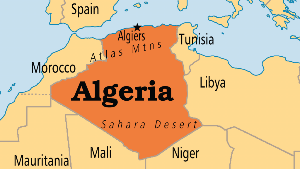- सीमाएँ: उत्तर में भूमध्य सागर, पश्चिम में मोरक्को, सहरावी अरब गणराज्य और मॉरिटानिया, दक्षिण में माली और नाइजर, पूर्व में लीबिया और ट्यूनीशिया।