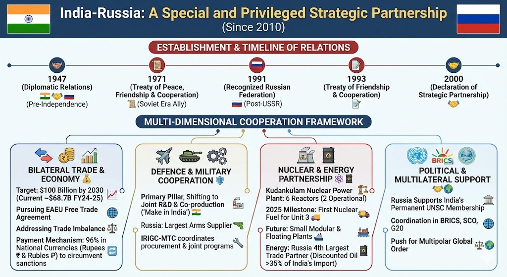 - आर्थिक और व्यापारिक परिवर्तन: रूस से रक्षा और ऊर्जा आयात के कारण भारत को भारी व्यापार घाटे का सामना करना पड़ा है, जिसने दोनों सरकारों को सहयोग विविधीकरण के लिए प्रेरित किया।