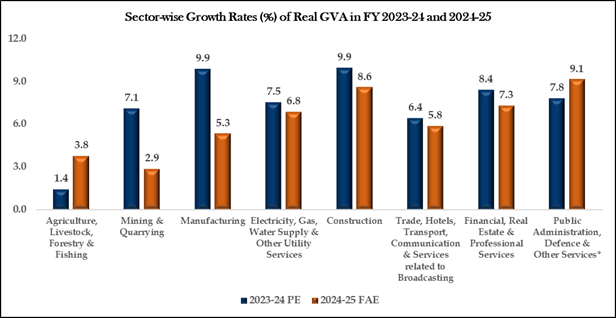 - वित्त वर्ष 2024-25 में वास्तविक सकल मूल्य वर्धन (GVA) 6.4% बढ़ा है, जबकि वित्त वर्ष 2023-24 में यह 7.2% था।