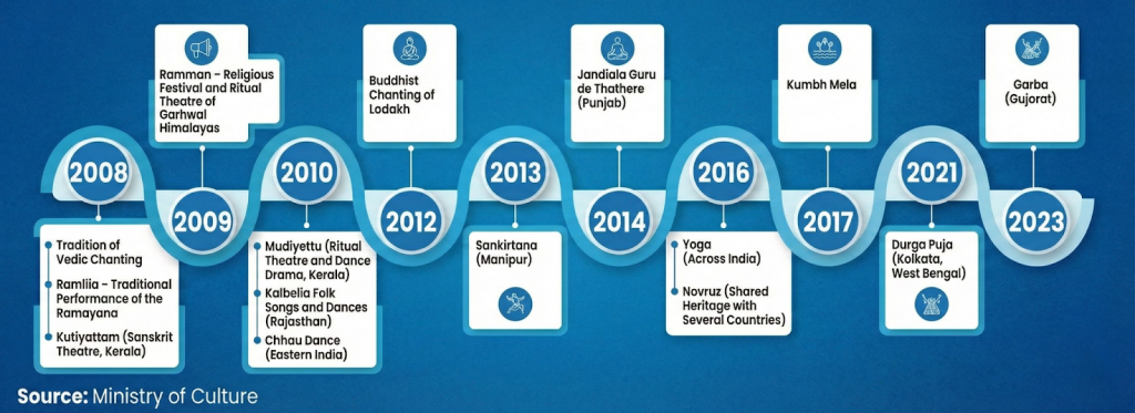- अब तक 15 भारतीय तत्वों को यूनेस्को प्रतिनिधि सूची में अंकित किया गया है और भारत तीन कार्यकालों के लिए यूनेस्को अंतर-सरकारी समिति में कार्य कर चुका है।