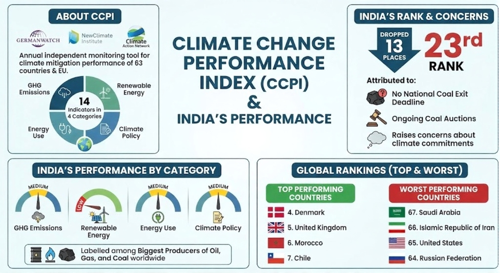- भारत नवंबर 2025 में ब्राज़ील में आयोजित COP30 के दौरान जारी क्लाइमेट चेंज परफॉर्मेंस इंडेक्स में 13 स्थान गिरकर 23वें स्थान पर आ गया।