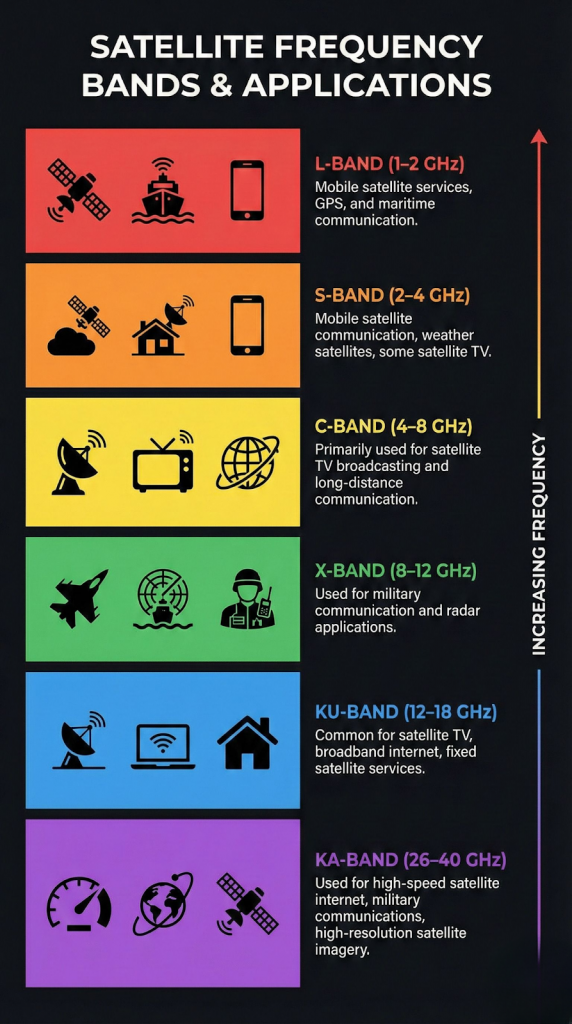 - सैटेलाइट स्पेक्ट्रम को विभिन्न आवृत्ति बैंडों में विभाजित किया जाता है, जिनमें से प्रत्येक विशेष प्रकार के संचार के लिए उपयुक्त होता है।