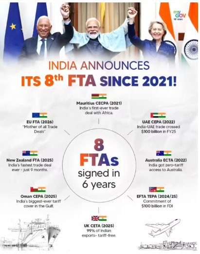 - गतिशीलता ढाँचा: FTA पेशेवरों के अस्थायी प्रवेश और प्रवास के लिए सुनिश्चित व्यवस्था स्थापित करता है, जिसमें व्यापारिक आगंतुक, अंतर-निगम स्थानांतरण, संविदात्मक सेवा प्रदाता एवं स्वतंत्र पेशेवर शामिल हैं।