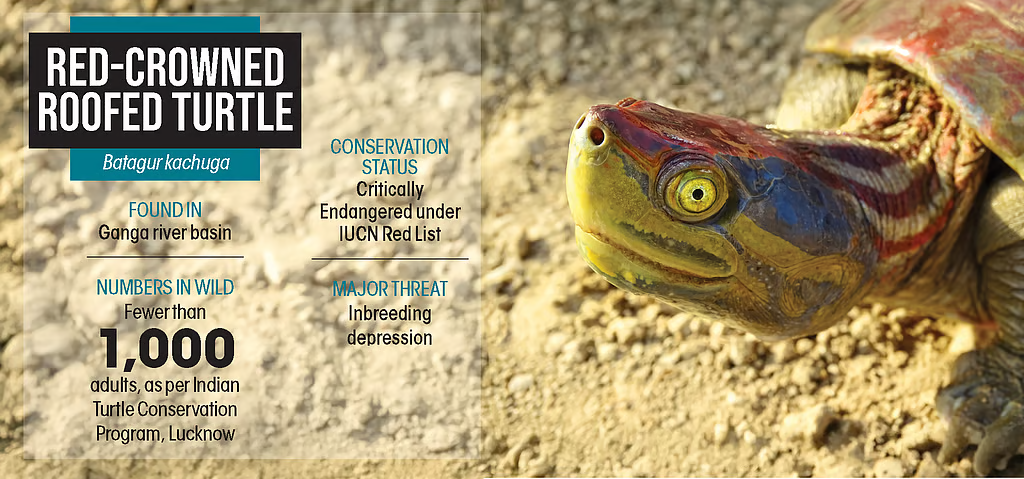 - कभी गंगा की शान रही रेड-क्राउन्ड रूफ्ड टर्टल अब तीव्रता से सिकड़ते आवास में जीवित है।