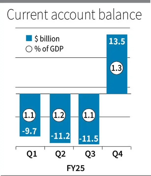 - भारतीय रिजर्व बैंक के अनुसार, भारत के चालू खाता शेष ने वित्त वर्ष 2025 की चौथी तिमाही (जनवरी-मार्च) में 13.5 बिलियन डॉलर का अपेक्षा से अधिक अधिशेष दर्ज किया।