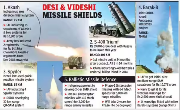 - लघु दूरी (25–50 किमी): स्वदेशी आकाश प्रणाली और इज़राइल का SPYDER रणनीतिक बिंदुओं एवं मोबाइल सेना इकाइयों की रक्षा करते हैं।