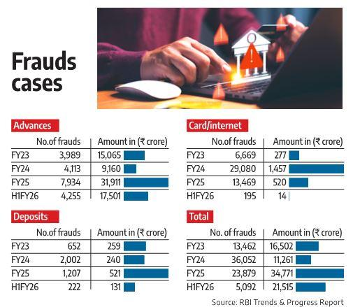 - अग्रिम-संबंधित धोखाधड़ी उच्च-मूल्य कॉर्पोरेट ऋणों से जुड़ी होती है, जो मामलों की संख्या घटने पर भी कुल राशि को बढ़ा देती है।