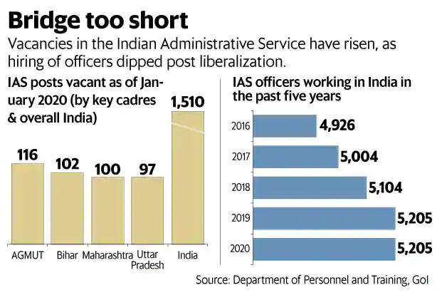 - Vacancies in the Indian Administrative Service have risen, as hiring of officers dipped post liberalization.