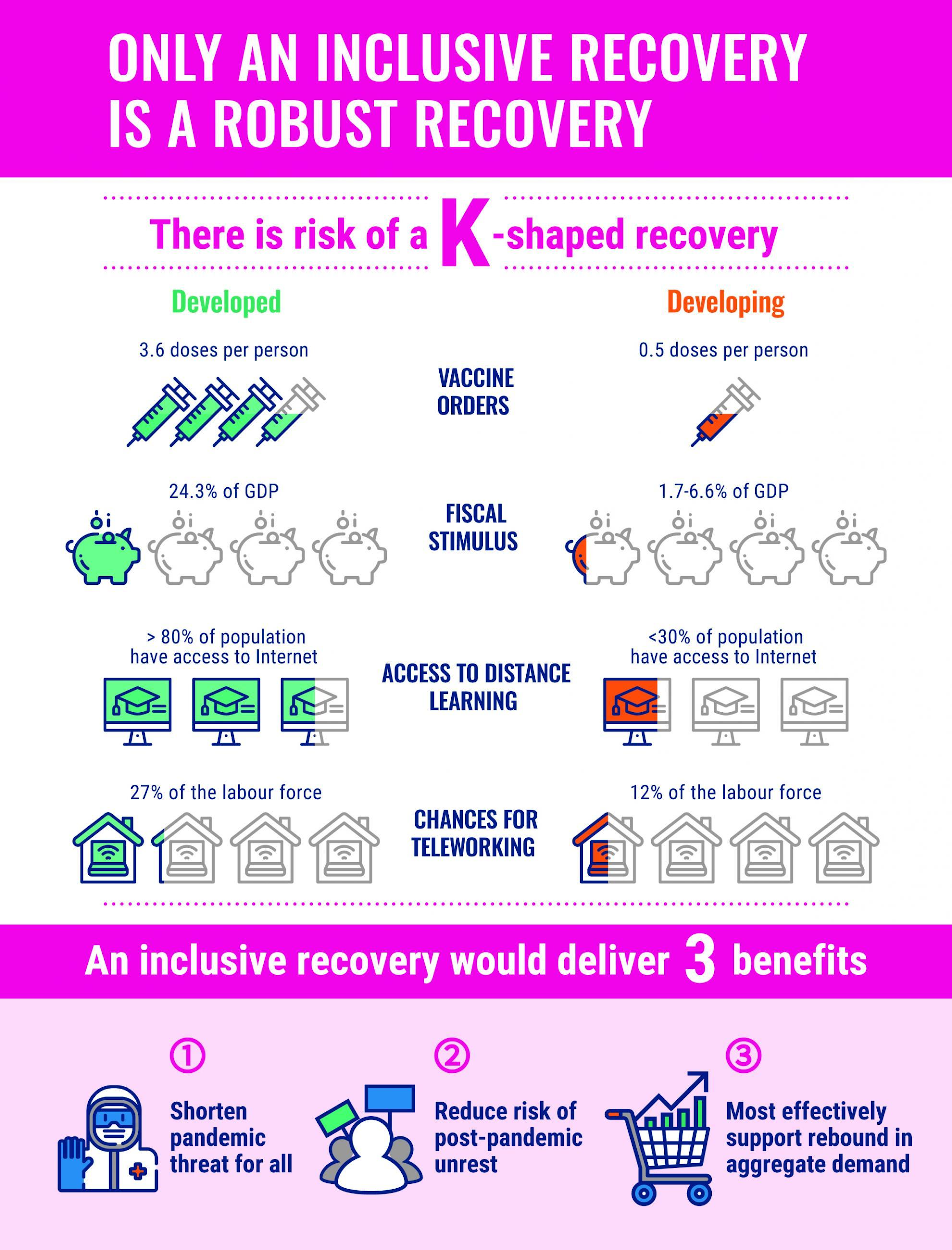 • The prospect of a K-shaped recovery, characterized by uneven post-pandemic recovery across countries and widened inequality gaps within countries, is highlighted as a primary policy challenge.