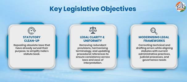 - It streamlines India’s legal framework by removing 71 obsolete or redundant laws (from 1886–2023) and making targeted amendments to modernize and correct inconsistencies in key statutes.