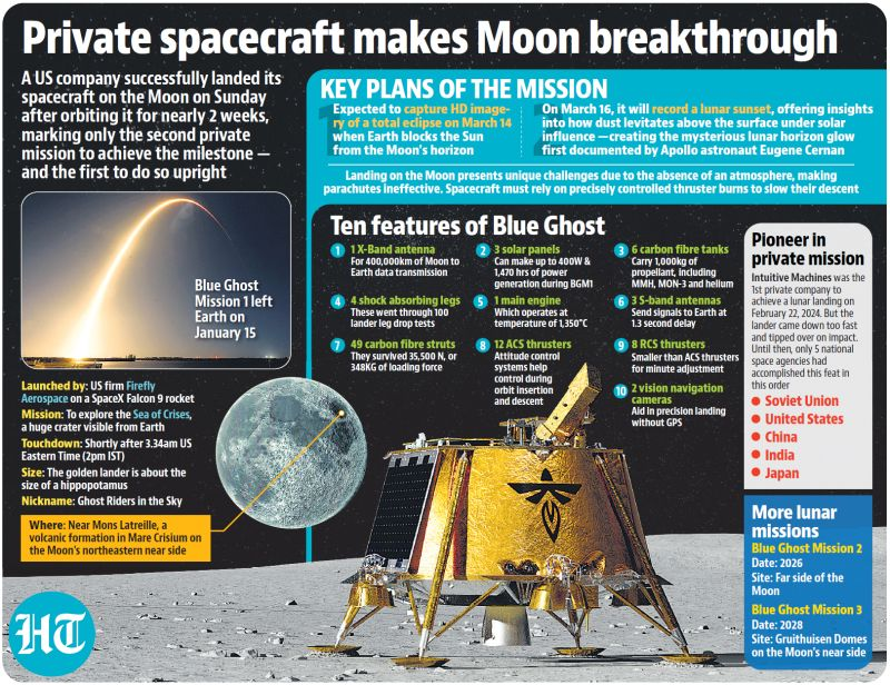 - Firefly Aerospace successfully landed its Blue Ghost lander on the Moon, becoming the first private mission to land upright.