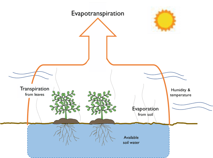 - There are factors that affect the rate of evapotranspiration in plants which include the amount of solar radiation, temperature, soil factors, wind, and atmospheric vapor pressure. Soil factors like the available soil moisture, the depth of the water table, and the density of vegetation really have a great influence on ET. Factors like plant morphology, plant cover, crop geometry, and root depth of the plant are also factors affecting evapotranspiration in plants.