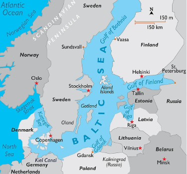 - It is located in Northern Europe, enclosed by Denmark, Estonia, Finland, Germany, Latvia, Lithuania, Poland, Russia, and Sweden.
