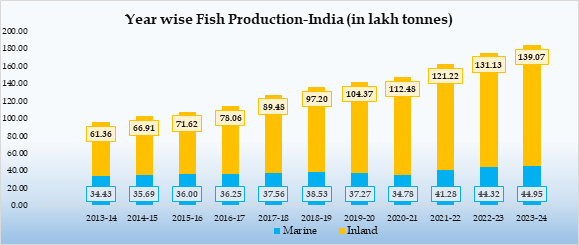 - Inland fish production has increased from 61.36 lakh tonnes in 2013-14 to 139.07 lakh tonnes in 2023–24, possibly indicating inland aquaculture and freshwater fisheries.