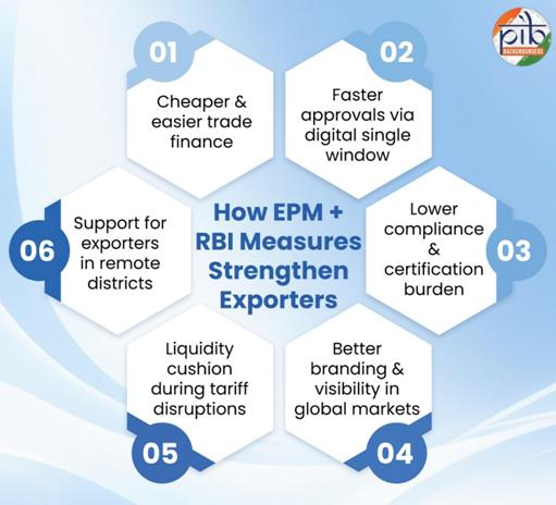 - Under EPM, priority support will be extended to sectors impacted by recent global tariff escalations, such as textiles, leather, gems & jewellery, engineering goods, and marine products.