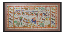 - Deep red, ochre, black, and rich blue colours from minerals, shells, and organic lac are used in these paintings.