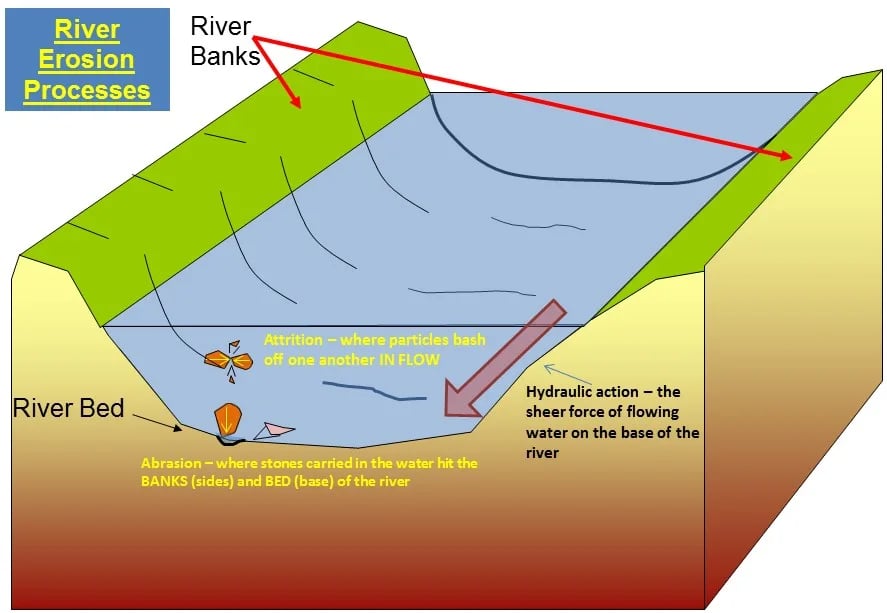 • Strong river currents: Fast-flowing water erodes the outer banks of bends (meanders).