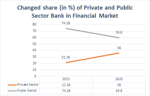 • Private banks’ market share in loans has risen to 36% in 2020 from 21.26% in 2015, while public sector banks’ share has fallen to 59.8% from 74.28%.