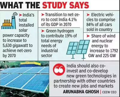 - Solar power capacity: India’s total installed solar power capacity will need to increase to 5630 gigawatts (GW) by 2070 in order to achieve net-zero emissions.