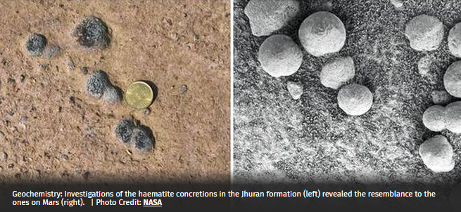- A recent study on Jhuran Formations (145 and 201 million years old) of Gujarat showed similarity between Haematite concretions in Kutch (India) and Mars.