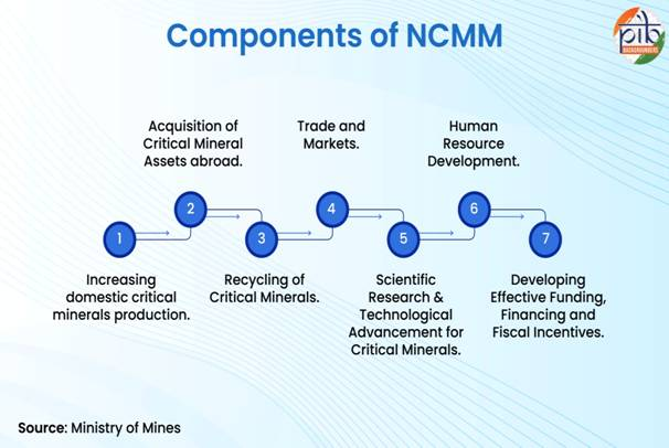 • The National Critical Mineral Mission (NCMM) with a ₹34,300 crore plan aims to strengthen the value chain from exploration to recovery.