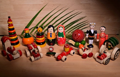 • Features : The toys are made mainly from Dhoodi Wood or Milkwood, as it is easy to carve out the shapes. However, craftsmen now use other types of hardwood like rubberwood, sycamore, silver wood and red cedar.