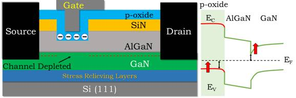Fig. 1. Device structure depicting the proposed novel aluminium titanium oxide, which acts as p-type gate oxide to achieve normally-off operation in GaN HEMTs and the energy band diagram depicting the proposed concept