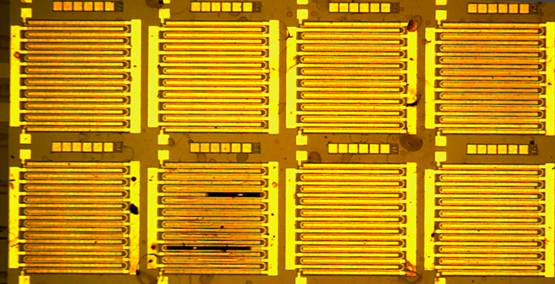 Fig. 2. Optical image of the fabricated e-mode HEMTs with the meandering gate structure