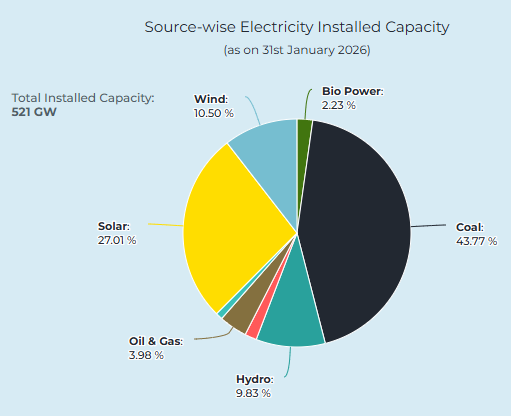 - India’s installed power capacity reached 520.51 GW as of January 2026, with the power shortage declining from 4.2% in FY14 to 0.03% till December 2025.