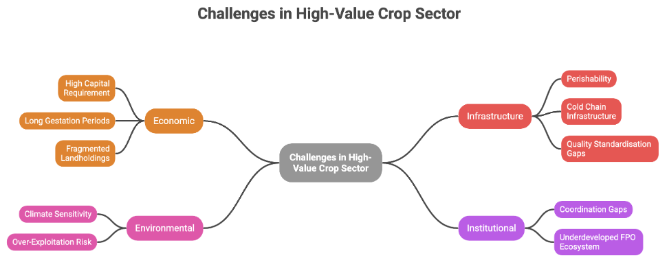 • Higher farmer incomes:  HVCs generate 3–4x returns per unit land compared to cereals, directly addressing agrarian distress