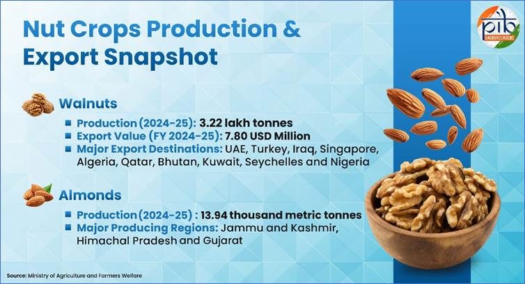 • Walnuts, Almonds, Chilgoza: India’s hilly regions cultivate several nut crops suited to cooler climates and specific agro-ecological conditions, including walnuts, almonds, and pine nuts.