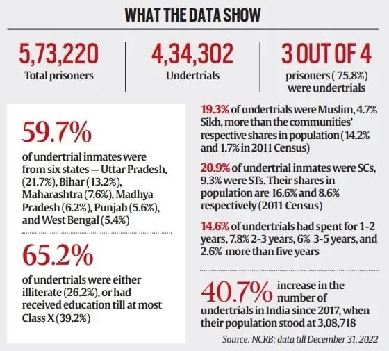 • 4,34,302 are undertrials against whom cases are still pending, amounting to nearly 75.8% of all prisoners in India.