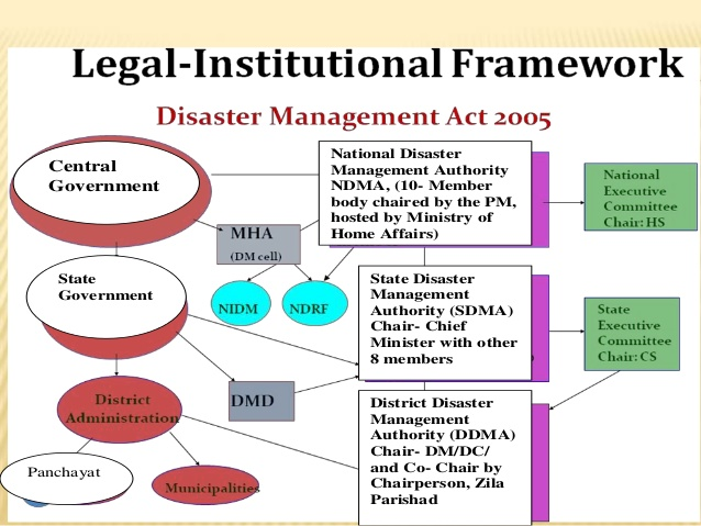 - The Act also provides for state and district level disaster management authorities responsible for, among other things, drawing plans for implementation of national plans.