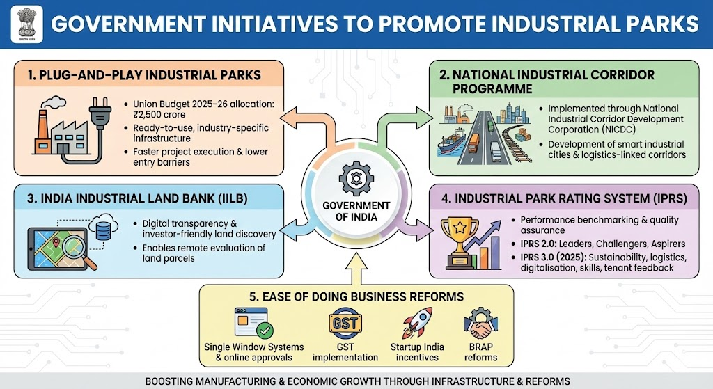 • Industrial parks have emerged as a core instrument of India’s industrial and innovation strategy, enabling faster manufacturing growth, higher investment, job creation and sustainable development.