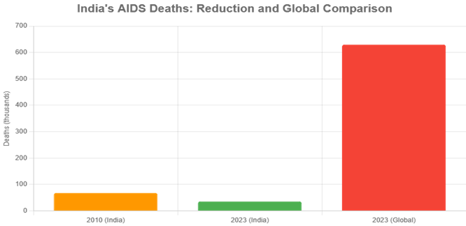 • India’s AIDS decline is more prominent than the global average, supported significantly by broadened testing, enhanced access to antiretroviral therapy, focused outreach to high-risk groups, and initiatives to combat stigma, all implemented through collaborative state and community actions.