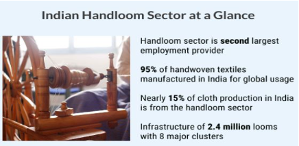 - Handloom weaving is one of the largest economic activities after agriculture providing direct and indirect employment to 35.23 lakh weavers and allied workers.